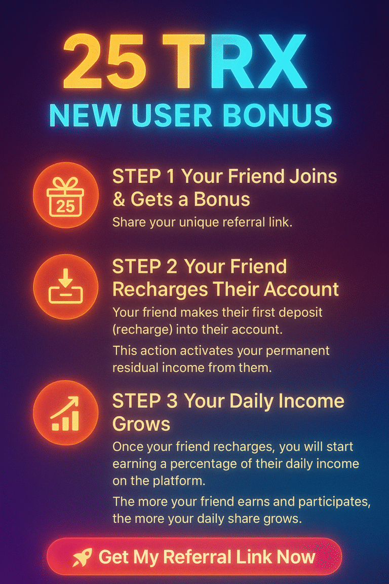 - Daily Earnings: 1% per day Capital Return: Your initial 400 TRX is fully returned over 100 days (break-even).